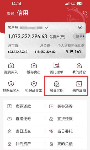 “融资融券-融资展期/融券展期”菜单可已进行下图中的操作: